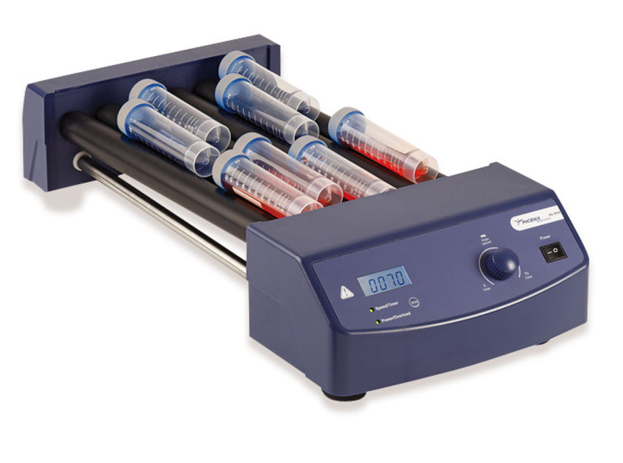 Simultaneous rolling and tilting movement for thorough mixing of samples, e.g. in centrifuge tubes and sample tubes. For vessel Ø max. 100 mm.